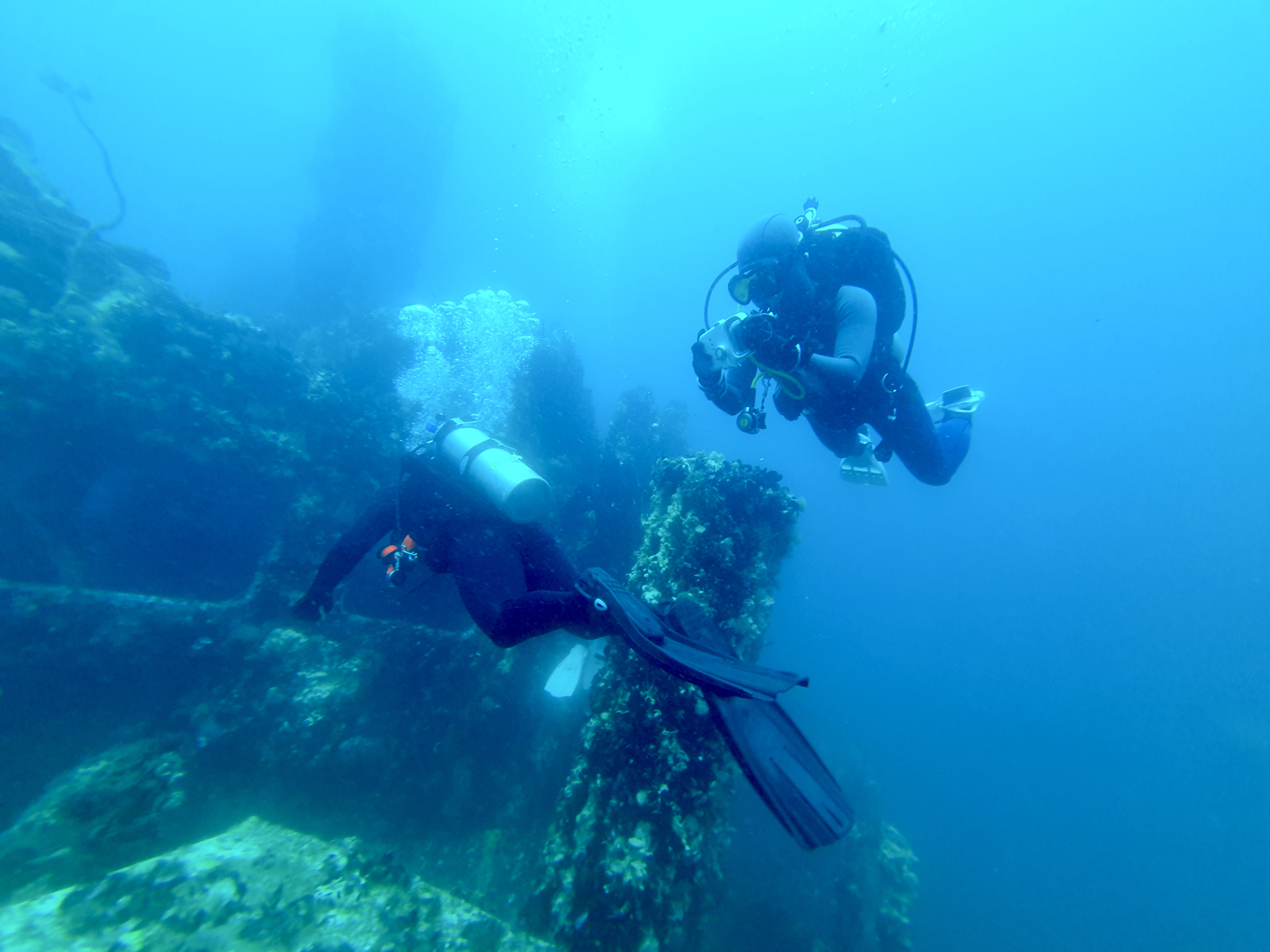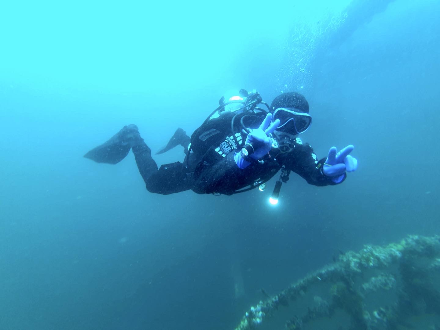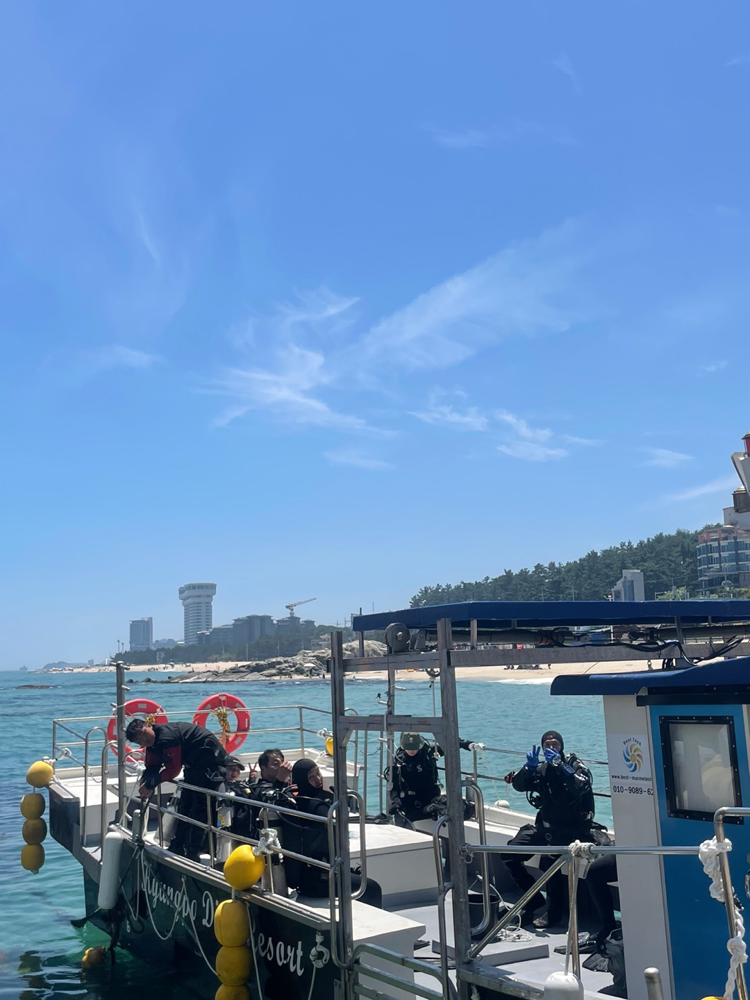 날씨가 매우 더운 날이라 드라이슈트를 안 입고 웻슈트를 입었었는데 막상 30미터 가까이 들어가니 매우 춥더라고요. 드라이슈트 입은 친구는 아주 편하게 다이빙했다고 합니다. 근데 나와서는 반대로 엄청 더워했네요. ^^